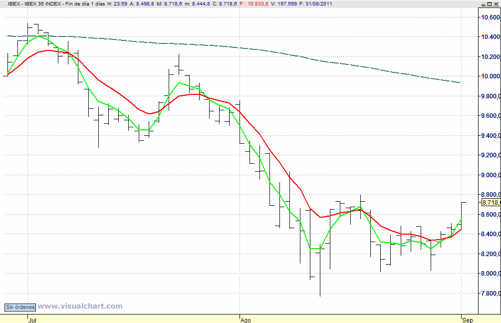Ayer tocaba cerrar el mes, nefasto por cierto y en el que se apreció una buena manita que le echaron en la subasta de cierre, para tratar de maquillar un tanto el descalabro que se ha dejado el índice en este mes de Agosto.Posibilidad de continuar con este rebote por tanto,como primeros de mes que estamos y teniendo que cuenta que estamos de vuelta de vacaciones,pero ya se empiezan a atisbar las primeras resistencias serias,la primera de las cuales está en los 8.800 puntos y algo más arriba ya la zona más seria,en el rango 9.200-400 puntos.