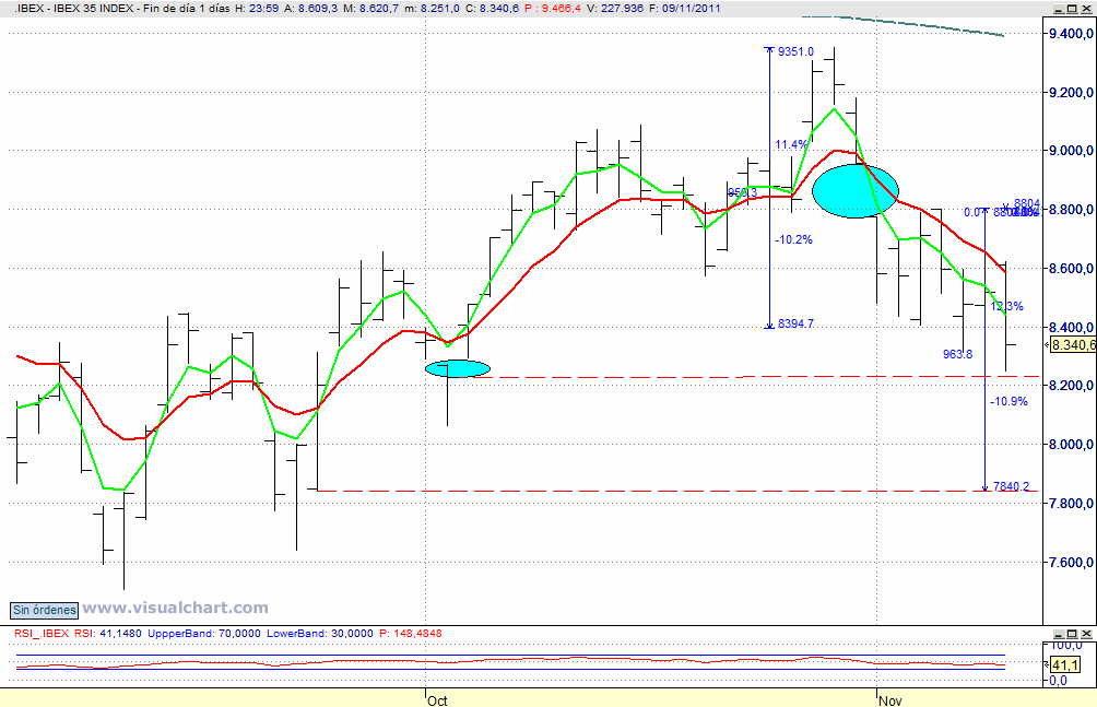 El primer tramo bajista desde los últimos máximos alcanzados fué de 950 puntos, por lo que por proporcionalidad bien pudiera descolgarse el Ibex hasta los 7.840 puntos, que sería la proyección bajista de este segundo tramo bajista que se viene produciendo.
